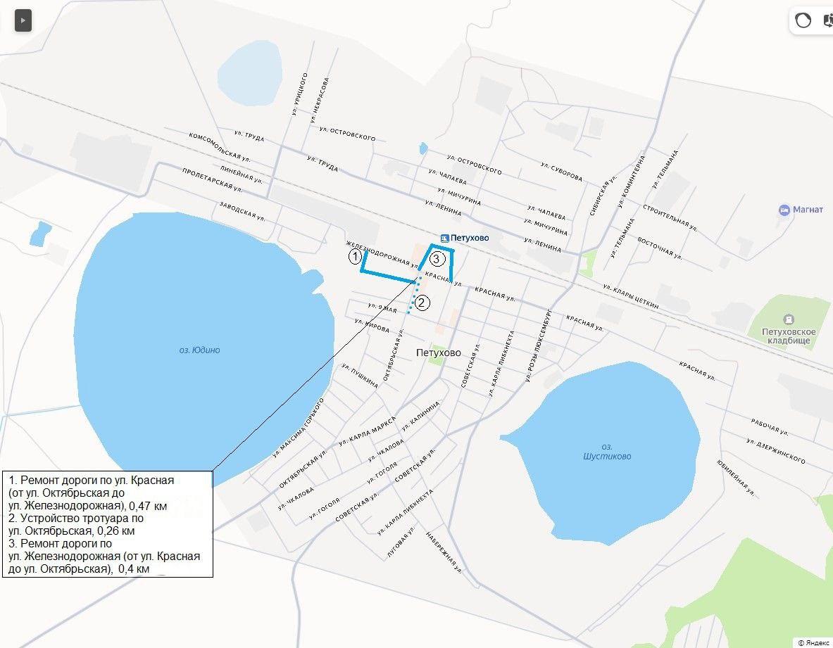 В Петухове ремонтные работы затронут участки Железнодорожной улицы от Красной до Октябрьской, а также Красной улицы от Октябрьской до Железнодорожной.