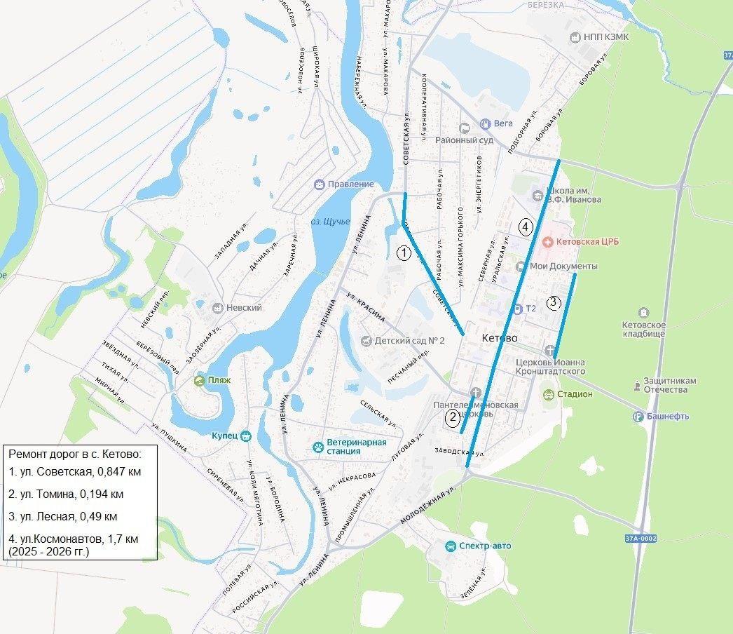 В селе Кетово планируется ремонт четырех улиц: Космонавтов, Лесной, Томина и Советской. В Глядянском обновят две: Ленина и Красногвардейскую. В Белозерском приведут в порядок подъездную дорогу к деревне Корюкина. В поселке Варгаши отремонтируют часть улицы Кирова от Ленина до Чернышевского. В Шумихе работы пройдут на Островского от Гоголя до Кирова. В Куртамыше обновят улицу 22-го партсъезда, включая центральную площадь.