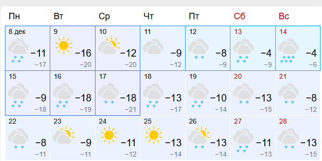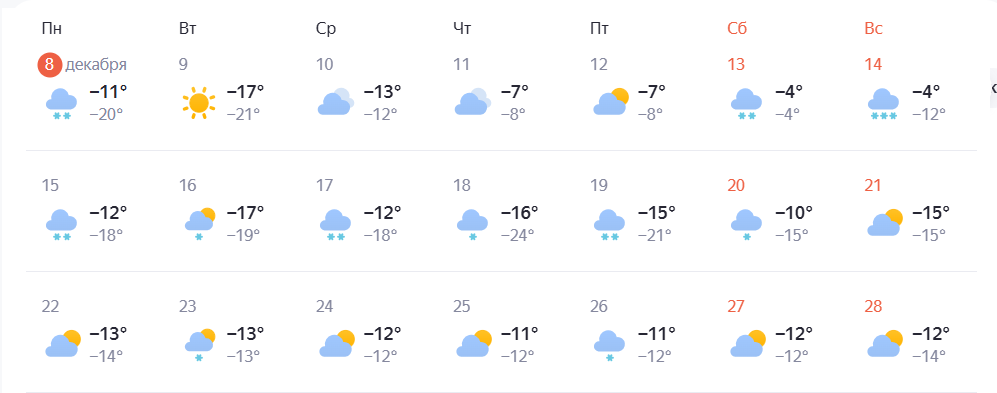 Согласно предварительному прогнозу «Гисметео», наиболее теплыми станут ближайшие выходные, 13 и 14 декабря, с дневной температурой до -4°. В остальное время столбик термометра не поднимется выше -8°. Особенно холодно будет 16 и 17 декабря, когда ожидается около -18°.