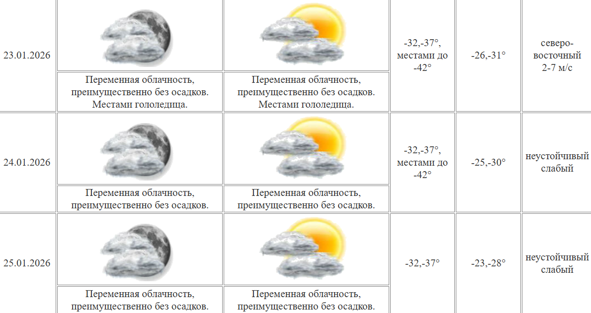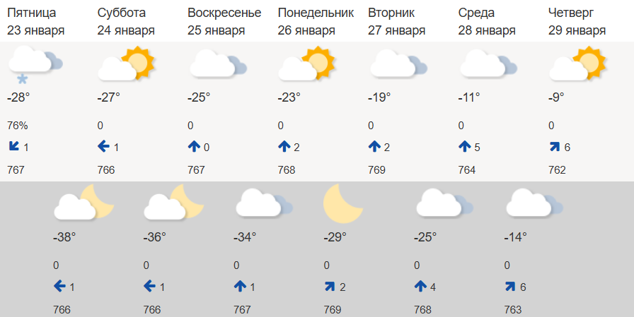 В следующую ночь похолодание немного ослабеет, но мороз останется сильным — около -36 градусов. Дневные температуры в субботу и воскресенье составят от -25 до -27 градусов. ЦГМС Кургана выпустил предупреждение о возможных заморозках в отдельных районах, где температура может достичь -42 градусов.