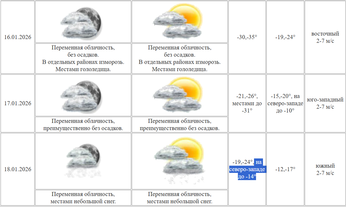 Гидрометцентр России сообщает о потеплении в Курганской области на предстоящих выходных. Днем в субботу, 17 января, воздух прогреется до -17 градусов. Сильных морозов не ожидается, однако в ночь на воскресенье вероятны снегопады. В воскресенье днем температура составит около -15 градусов.