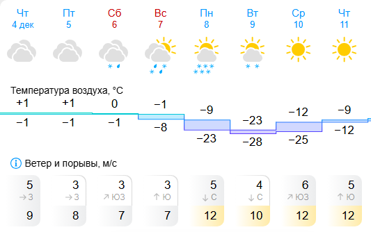В ночь на 9 декабря ожидается -23 градуса. Во вторник днём сохранится такой же мороз, а ночью похолодает до -28 градусов. В среду снег прекратится, и днём будет -12 градусов.