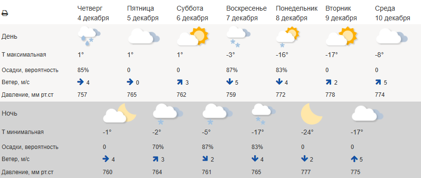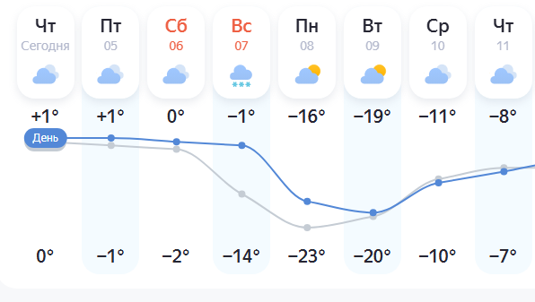 Прогноз «Росгидромета» отличается: в понедельник днём -16 градусов с небольшим снегом, ночью — -24. Во вторник температура составит -17 градусов как днём, так и ночью.