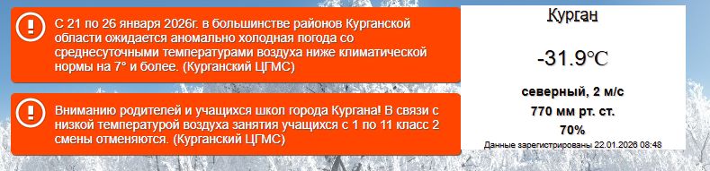 22 января в Кургане из-за аномально низких температур отменили занятия для учащихся второй смены с 1 по 11 классы. Все уроки будут проведены дистанционно. Утром в городе зафиксировали температуру -31,9 градуса.