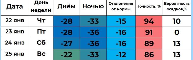Метеорологи прогнозируют ночные температуры в диапазоне -33...-35°, а дневные — -26...-28°. Подобные морозы продержатся до 26 января. Наиболее сильное похолодание ожидается в ночь на 23 января, когда столбик термометра может опуститься до -40°.