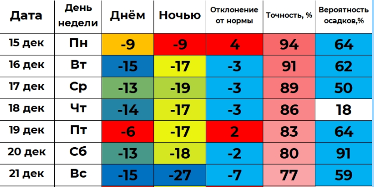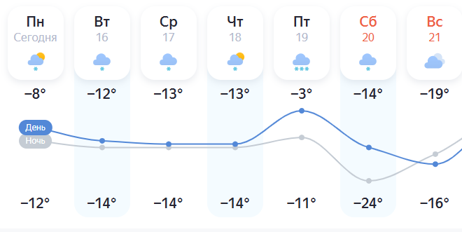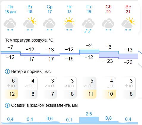 Согласно «Яндекс Погоде», в понедельник, 15 декабря, днём ожидается -8°C, ночью — -12°C. Местами возможен слабый снег, гололёд или налипание снега. Со вторника по четверг дневная температура составит -12°C...-13°C, ночью — около -14°C. В пятницу, 19 декабря, потеплеет до -3°C, снег будет идти весь день. На выходных прогноз показывает -14 и 19 градусов. В ночь с 20 на 21 декабря температура опустится до -24°C.