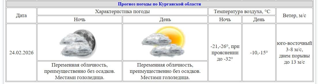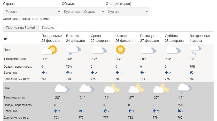 В столице региона, Кургане, ожидается особенно холодная ночь с 23 на 24 февраля. Столбик термометра может показать -26 градусов. Кроме того, морозными будут ночи с 26 на 27 и с 27 на 28 февраля, когда температура опустится до -27 градусов.