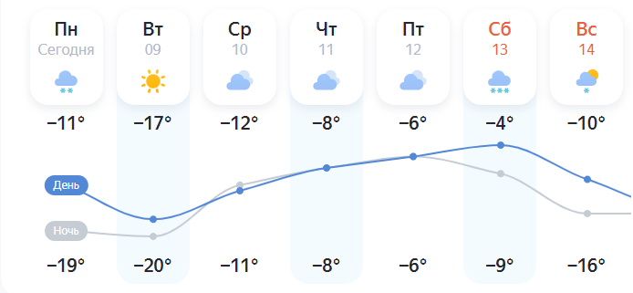 Согласно прогнозу Яндекс.Погоды, снег ожидается в понедельник, а затем в выходные 13-14 декабря.